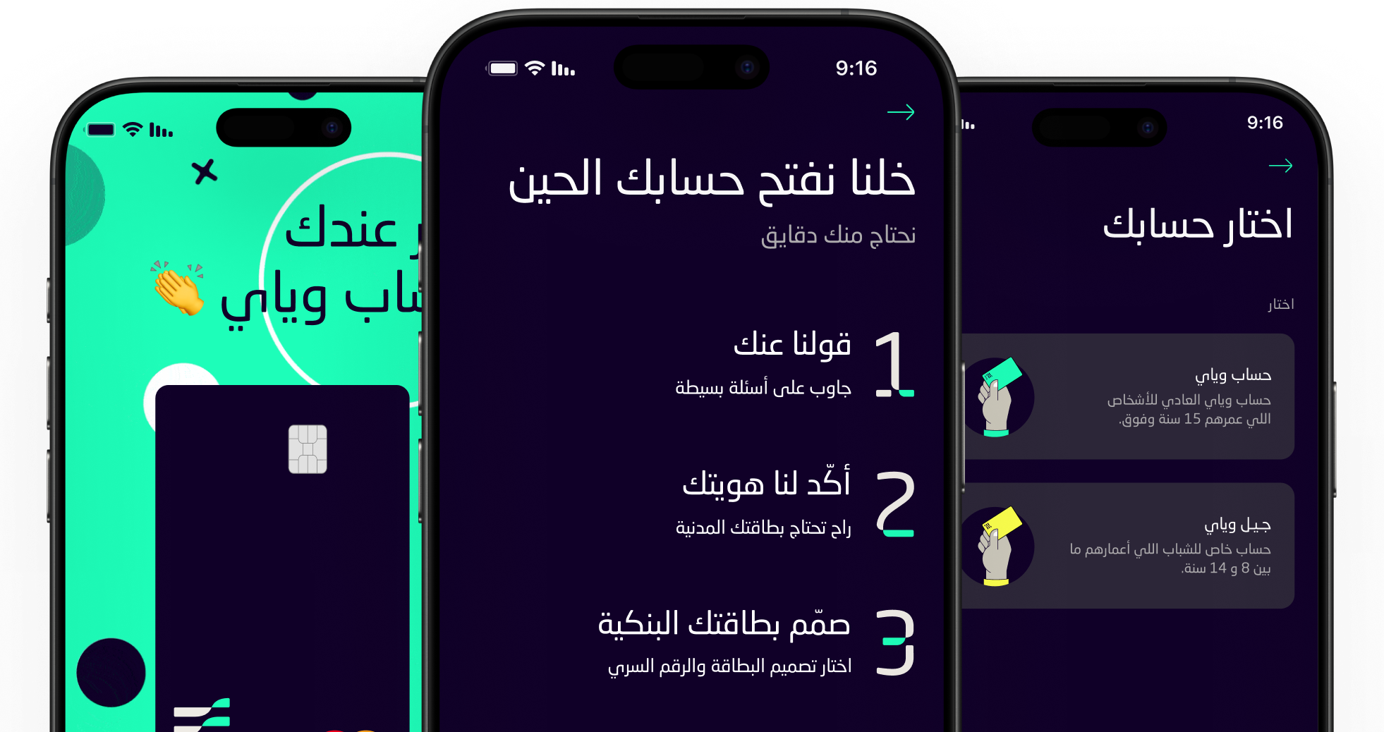 عملية فتح الحساب رقمية 100% وفورية. راح تطلّع بطاقتك المصرفية بشكل فوري واحنا نوصلها لك وتقدر تتابعنا واحنا نوصلها لك. حمّل تطبيق وياي وشوف الخطوات المطلوبة منك وخلال دقايق راح يصير عنك حساب وياي.